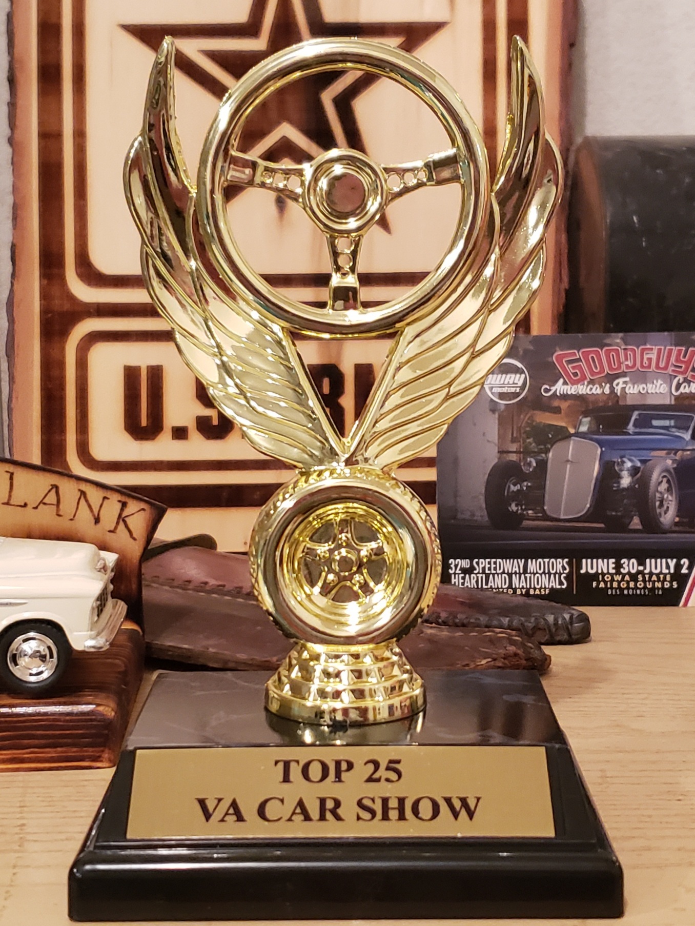 There were two car shows we considered for this day, and we feel we picked the right one. We drove five miles round trip from home. This show started at the VA Hospital grounds and last year was at Southridge Mall, but they announced this is the final move they will make. This show was held at River Place on Euclid down by the Des Moines River. The trees provided a nice background and we found shade under a tree. Gary Pullen invited us to park by him and we ended up with a nice spot to show MaryLoo. Oh, and we were honored to win a Top 25 trophy 😃